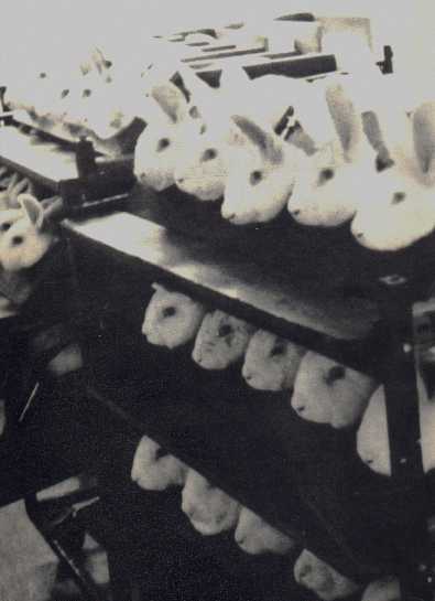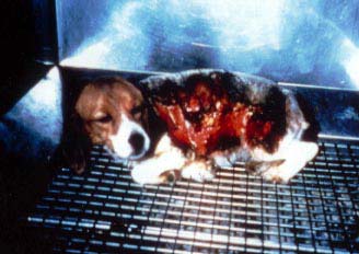shown above, or caged, as is the beagle at left, so they cannot escape
